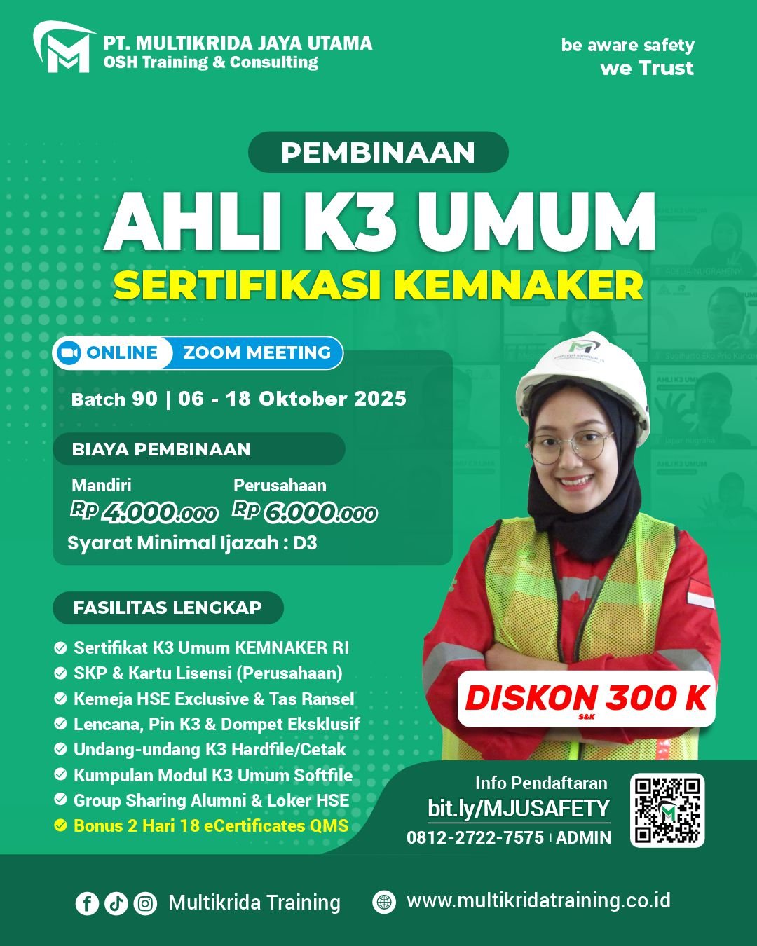 BAGUS SEKALI Berdasarkan 137 ulasan Fahrun Nizar09/09/2025Trustindex memverifikasi bahwa sumber asli ulasan adalah Google. Terimakasih sudah manjadi jembatan untuk belajar K3,terimakasih sudah memberikan arahan dan kelancaran selama pelatihan. Ridwan Kamarullah09/09/2025Trustindex memverifikasi bahwa sumber asli ulasan adalah Google. Mengikuti pelatihan Online AK3U di Multikrida sangat memuaskan dan efisien, materi yang disampaikan oleh para praktisi sangat mudah di pamahami. Sukses dan Jaya selalu Multikrida Jaya Utama, next Insya allah bisa ambil Smk3 atau POP Ramdan Hidayat03/09/2025Trustindex memverifikasi bahwa sumber asli ulasan adalah Google. Pelatihan AK3 UMUM di PT MJU fleksibel, bisi ikut pelatihan online tapi bisa sambil kerja juga, terima kasih PT MJU semoga semakin maju dan sukses selalu 🤲 Joe Saputra25/08/2025Trustindex memverifikasi bahwa sumber asli ulasan adalah Google. mantap muhammadrefli 0125/08/2025Trustindex memverifikasi bahwa sumber asli ulasan adalah Google. Materinya semuanya daging dan pemateri keren-keren Saeful Adnan11/08/2025Trustindex memverifikasi bahwa sumber asli ulasan adalah Google. Terima kasih MJU atas pelatihan POP nya berjalan dengan baik dan sukses,semoga ke depanya MJU semakin jaya Aldi Anor11/08/2025Trustindex memverifikasi bahwa sumber asli ulasan adalah Google. Terimakasih buat PT. MJU semoga kedepannya sukses selalu